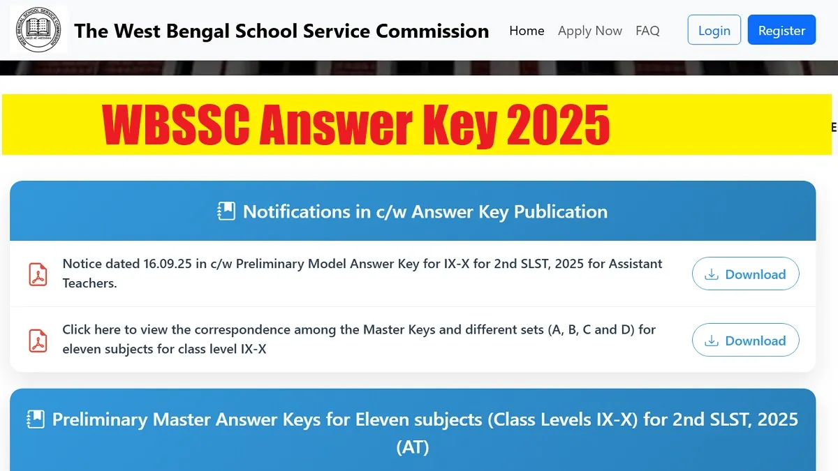 The West Bengal Central School Service Commission (WBSSC) has released the official Answer Key for the Assistant Teacher Recruitment 2025. The answer key for Classes IX & X has been released on 16 September 2025 (exam held on 7 September), while the answer key for Classes XI & XII will be released on 20 September 2025 (exam held on 14 September) at westbengalssc.com. This recruitment drive aims to fill a total of 35,726 vacancies.
