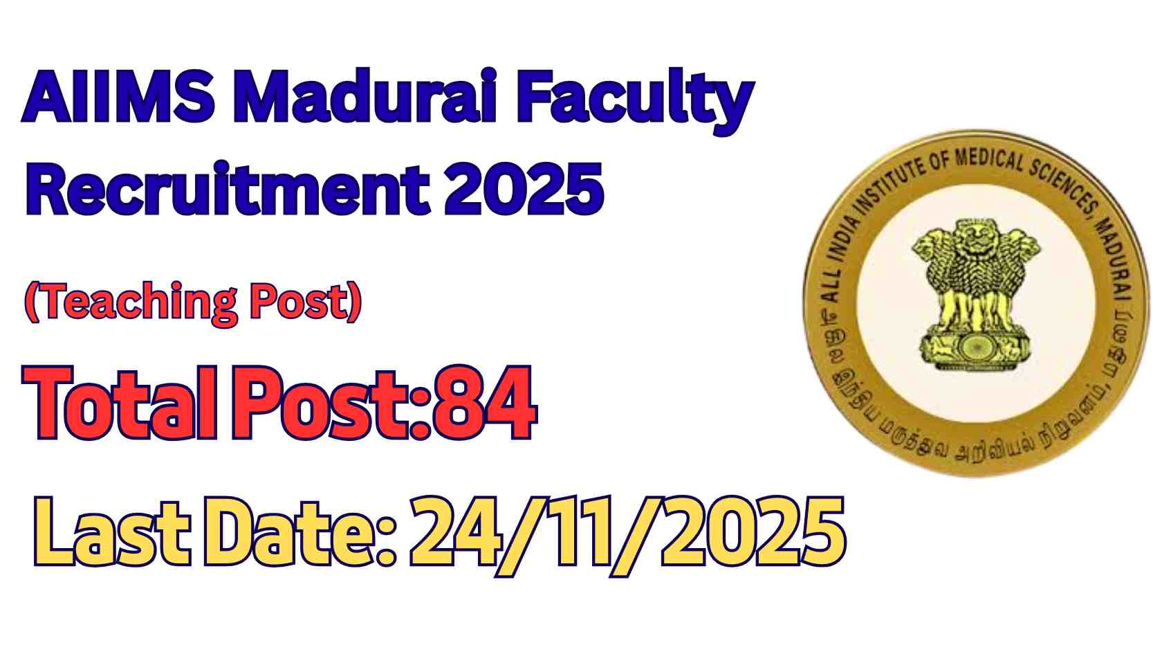 AIIMS Madurai Faculty Recruitment 2025 – Apply Online 84 Assistant Professor, Professor and Other Posts Last Date - 24 November 2025