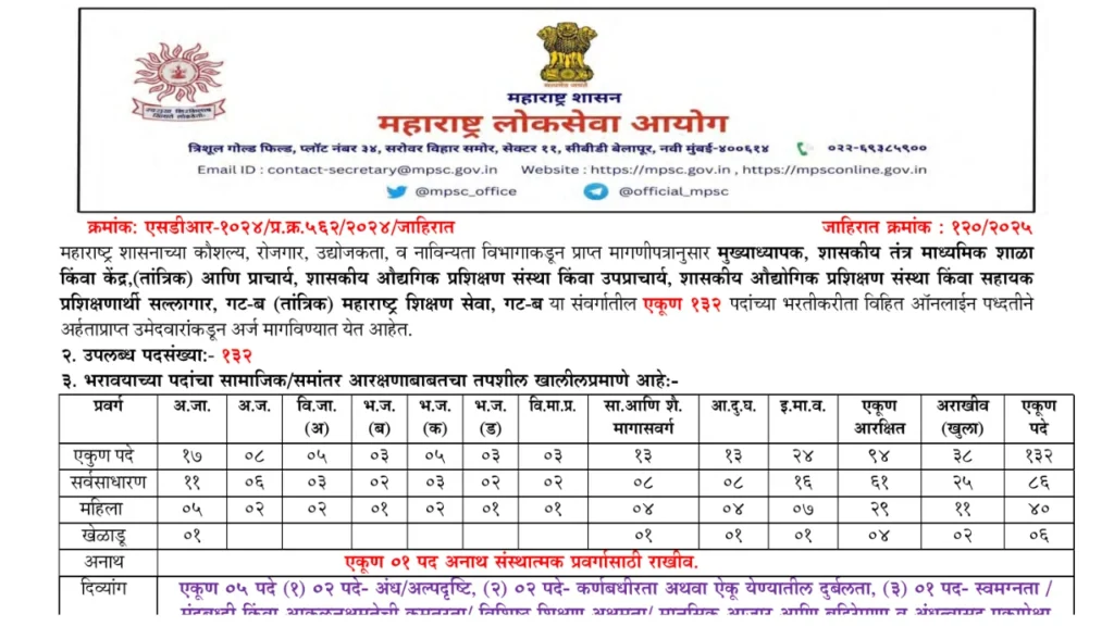 MPSC Recruitment 2025 – Apply Online 132 Headmaster, Principal and Other Posts Last Date 15 October 2025