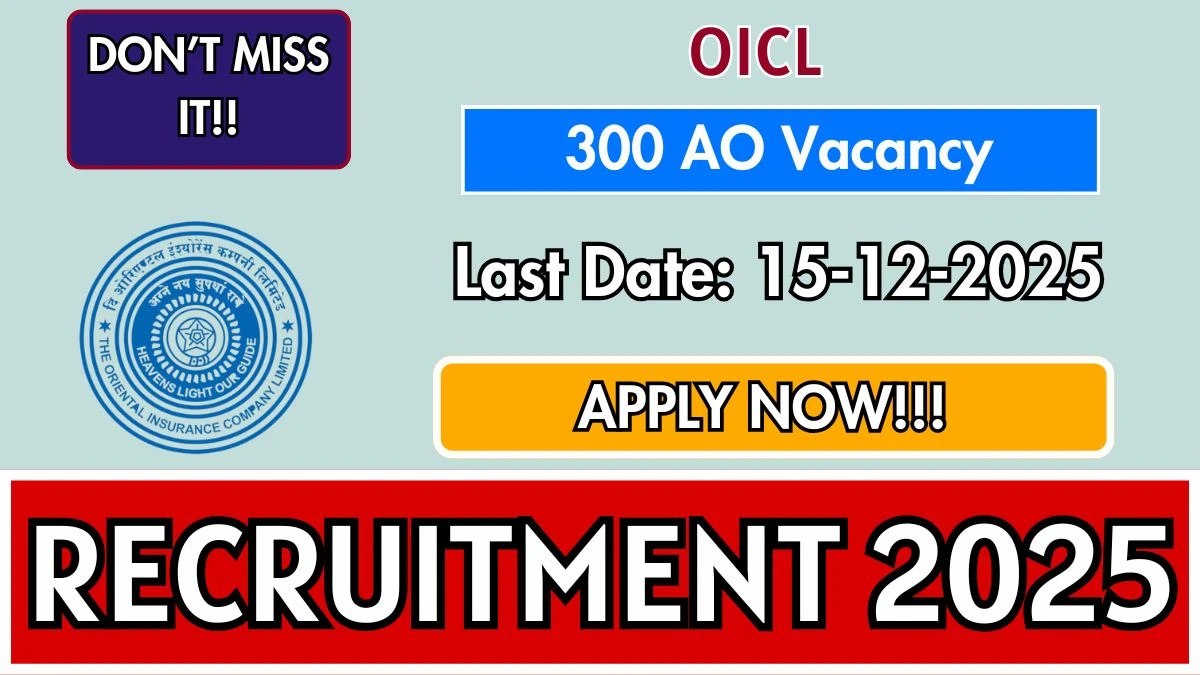 Oriental Insurance Company Limited (OICL), has released a short notice on official website for the recruitment of Administrative Officer Post. This recruitment is for 300 positions. OICL Application Form will start from 01 December 2025 & the candidates can apply till the 15 December 2025. Minimum age required is 21 Years & The Maximum Age Is 30 Years as on 31 December 2025. Candidates must check the complete details for OICL Administrative Officer Recruitment 2025. Link are given below.